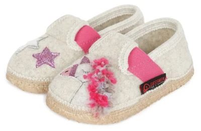 Das Motiv mit aufwändigen Applikationen wie dem Einhorn mit wallender Mähne und den Glitzersternen überzeugt Mädchenherzen immer wieder. Auch die weiche Schurwolle, der durchdachte Schnitt und die rutschfeste Sohle punkten bei diesem Mädchenslipper garantiert.