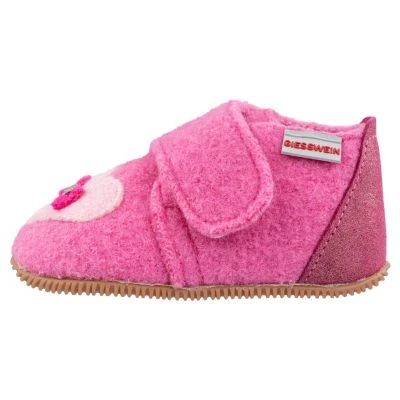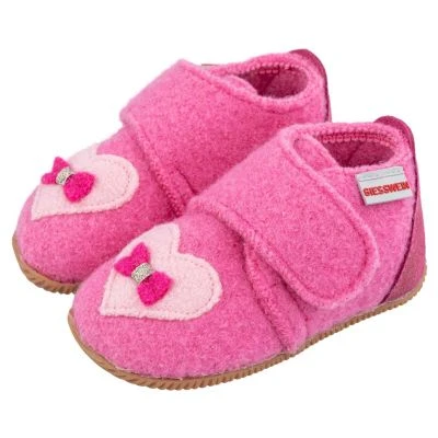 Mit dem rosa Slipper namens Oberahr kann der Herbst starten. Die süße Herzapplikation lässt Kinderaugen strahlen. Die Slim Fit-Schuhe aus Wolle haben einen Klettverschluss, der den Einstieg erleichtert. Die Sohle besteht aus festem Naturkautschuk.