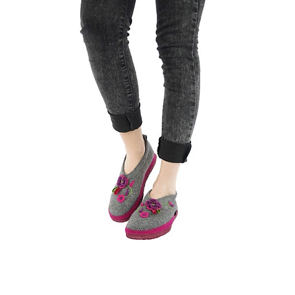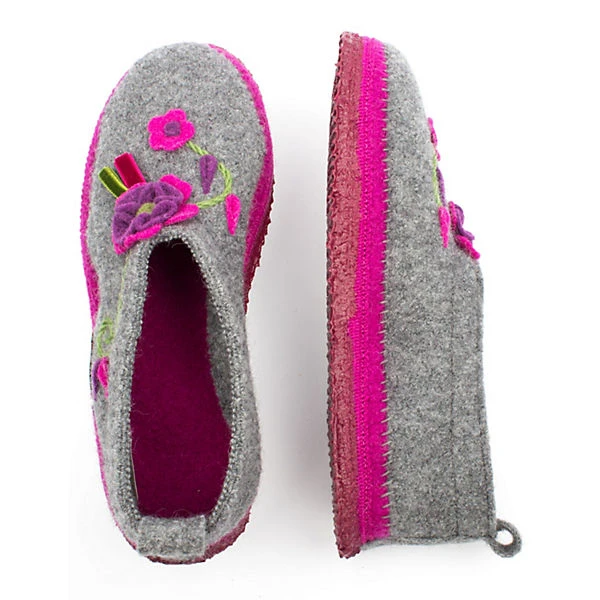 Die detailreiche Blumenapplikation macht diesen Schuh zu einem echten Schmuckstück. Die Filzhausschuhe sind in zwei verschiedenen Farben erhältlich und eigenen sich auch für Einlagen. Die weiche Naturkautschuk-Sohle ist rutschfest, leicht, flexibel und verleiht ein Gefühl des Barfußgehens.