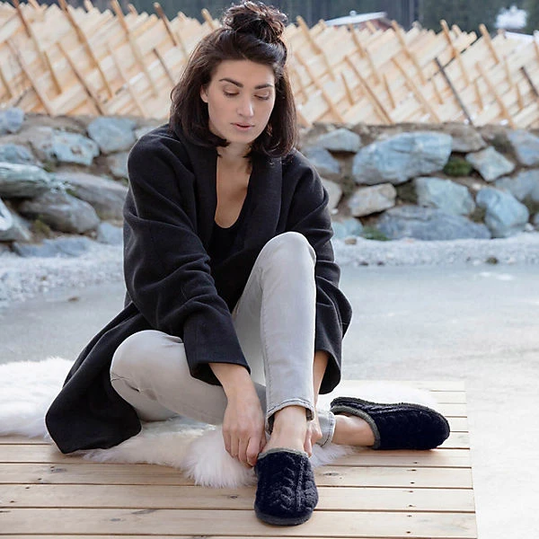 Warmer Winterpantoffel mit Zopf-Strickmuster – erhältlich in verschiedenen Farben. Modell „Neudau“ ist geeignet für unser Wechselfußbett oder zum Tragen von eigenen Einlagen. Die weiche Naturkautschuk-Sohle ist rutschfest, leicht, flexibel und verleiht ein Gefühl des Barfußgehens.