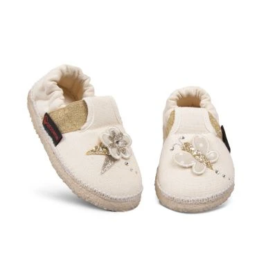 Zart und niedlich wird es mit Kinderhausschuh Arnshöfen. Der Schuh überzeugt im schlichten naturweiß mit gold-glitzernden Akzenten. Der Schmetterling mit Flügel im 3D-Effekt kann kaum herzlicher sein. Trotz zarter Erscheinung ist dieser Schuh auch auf Abenteuer ausgerichtet. Das gold-glitzernde Bündchen und die rutschfeste Kautschuksohle sorgen für ausreichend Halt. Und falls die zarten Schuhe einmal beim Herumtoben Zuhause oder im Kindergarten schmutzig werden, kann man sie einfach in der Waschmaschine waschen.