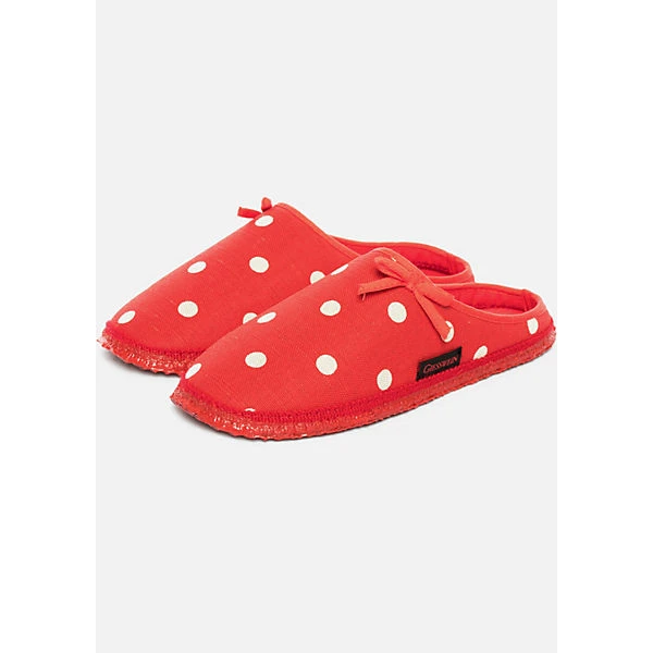 Süß und mädchenhaft ist der Pantoffel Plein mit Tupfen und Masche. Der hochwertige Baumwollstoff und die superweiche Naturlatexsohle machen ihn zum perfekten Wohlfühlschuh für daheim. Erhältlich in Natur, Rot und Dunkelblau. Obermaterial 100% Baumwolle. Die Laufsohle ist rutschfest und dennoch leicht und flexibel.